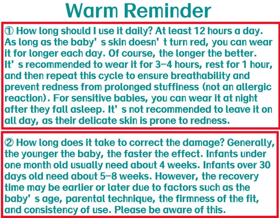 My baby has seen a significant improvement after using it. I hope it will continue to grow well! I started using it after about ten days, and after wearing it for about a week, the correction was satisfactory. It’s especially effective for very young babies. It’s very soft, so it doesn’t hurt the child when worn. The included tape helps secure it, and it doesn’t fall off while sleeping. I’m very satisfied.
